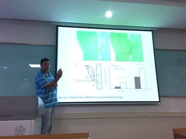 以色列海法大学Moshe Inbar教授于2016年6月25日至7月1日来半次元 进行科研合作与交流,并为广大师生做了两场精彩的学术报告。6月27日,Moshe Inbar教授为师生作题为“Defense strategies in pea aphids”的学术报告。报告展示了豌豆蚜虫在跌落的过程中通过旋转自己的身体到稳定的直立方向,从而提高了在途中遇到植物叶片时附着的机会,降低掉落到地面的危险,它们通过这种方式逃避天敌进行自我防御。6月29日,Moshe Inbar教授作题为“Functional ecology of host plant manipulation by gall forming insects”的报告,向大家讲述了奇妙的造瘿昆虫,以及这些昆虫的造瘿机制。在报告的互动环节,Moshe Inbar教授与半次元 师生就共同感兴趣的相关问题进行了详细的探讨,精彩的提问和妙趣横生的回答获得了大家热烈的掌声。